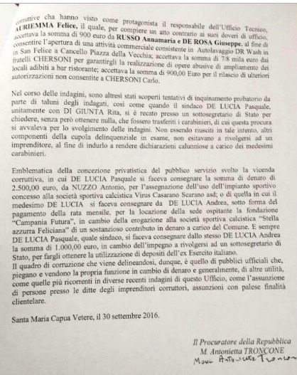 Arrestato anche il sindaco di San Felice a Cancello, (consigliere provinciale di Caserta e in passato è stato consigliere regionale). Nei confronti del primo cittadino, che fino allo scorso mese di maggio, quando si è dimesso, era vicepresidente della Provincia di Caserta è indagato su una vicenda di appalti concessi in cambio di mazzette.sono contestati i reati di associazione per delinquere, finanziamento illecito ai partiti, corruzione. La stessa indagine della Procura di Santa Maria Capua Vetere vede coinvolti anche il vicesindaco, consiglieri comunali e imprenditori.