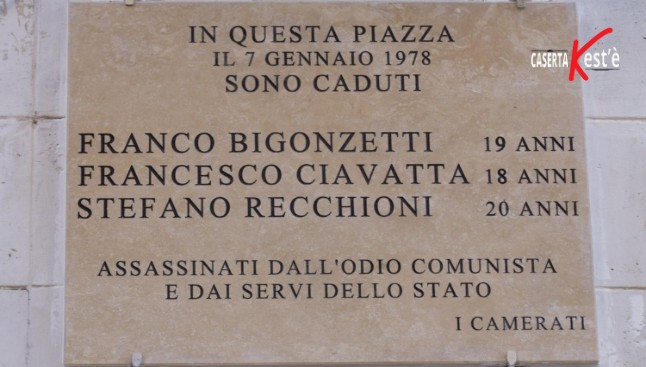 Il 7 gennaio del 1978 davanti la sede missina di via Acca Larentia, persero la vita tre giovani. Franco Bigonzetti, Francesco Ciavatta e Stefano Recchioni furono “assassinati dall’odio comunista e dai servi dello Stato”. La targa, firmata “I camerati”, sintetizza così.