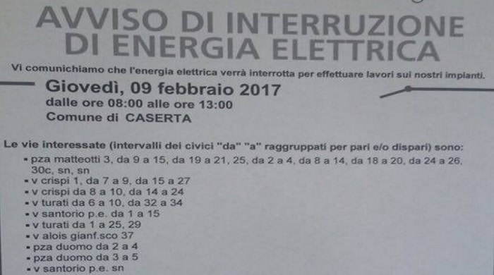 Ai lettori si comunica che  Giovedi 9 Febbraio in alcune zone della città di Caserta sarà interrotta la fornitura di energia elettrica. Avviso di interruzione di energia elettrica