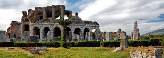Il più antico teatro d’Italia interamente costruito su volte si trova a Teano, provincia di Caserta, famosa per l’incontro fra Garibaldi e Vittorio Emanuele II dopo la battaglia del Volturno. A Santa Maria Capua Vetere combattevano i gladiatori, qui si potevano gustare spettacolo teatrali all’aria aperta, come da tradizione nel teatro greco-romano. L’edificio comincia ad assumere prestigio con l’età di Augusto, quando l’antica Teanum Sidicinum viene innalzata a rango di colonia romana. Nel III secolo la struttura viene completamente rinnovata, prima sotto Settimio Severo, poi sotto Gordiano III. Sin dal IV secolo d.C., e di nuovo tra il VIII ed il IX secolo, sulle rovine dell’edificio, probabilmente crollate per un terremoto, si impiantò un cantiere di spoglio teso al recupero ed al riutilizzo dei materiali architettonici di marmo.