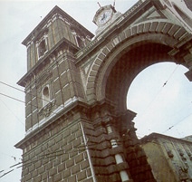 Il celebre arco che segna l’ingresso al centro storico di Aversa fu costruito nel 1777 per collegare la Trecentesca Real Casa Santa, istituto per l’assistenza a orfani e infermi, alla torre campanaria del 1712, sorta a sua volta in sostituzione di quella lignea e ormai fatiscente d’epoca Quattrocentesca. Una commistione unica di stili e gusti architettonici, che culminano nel poderoso orologio a doppia faccia che sormonta l’arcata e segna da centinaia d’anni il trascorrere delle giornate aversane. La Real Casa Santa è sicuramente il “pezzo forte” del complesso: la sua esistenza è attestata da un documento della Santissima Annunziata di Sulmona del 1320.