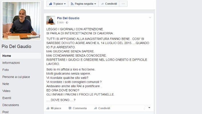 L’esternazioni dell’ex sindaco Pio Del Gaudio sulla sua pagina fb…pochi minuti fa