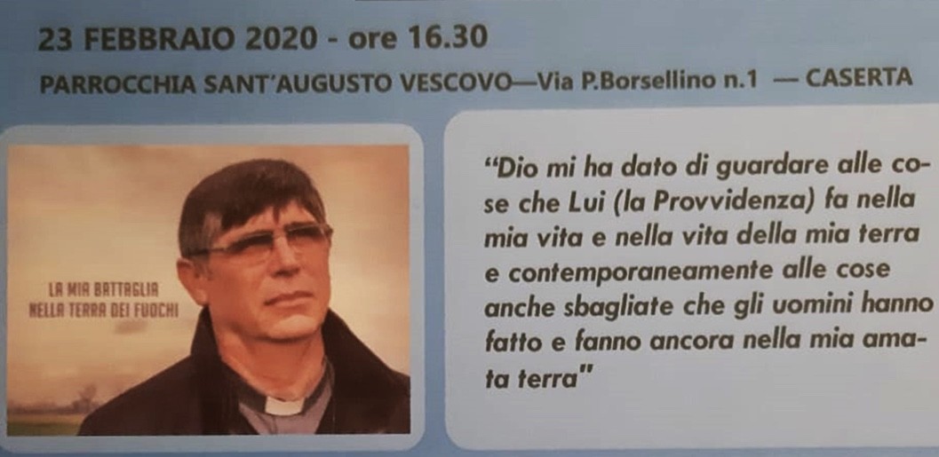 Il suo impegno per restituire alla cittadinanza il ruolo di Terra Madre e alle persone la dignità di vivere in luoghi sicuri e dignitosi, ha inizio tanto tempo fa e continua, senza sosta, anche oggi. Di questo, di ambiente e di legalità si parlerà domenica 23 febbraio, presso la parrocchia di S.Augusto a Caserta, in un incontro a tu per tu con il sacerdote simbolo della lotta allo smaltimento illegale dei rifiuti.