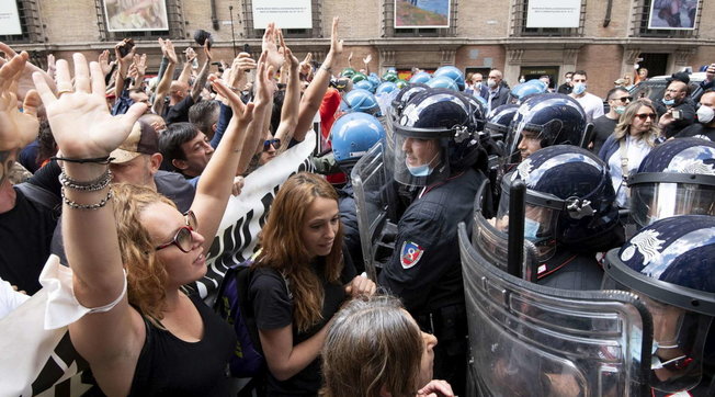 “IL virus è un trucco per inventare la crisi”, urlano i manifestanti contenuti dai cordoni della polizia che blindano l’accesso delle strade verso Montecitorio.