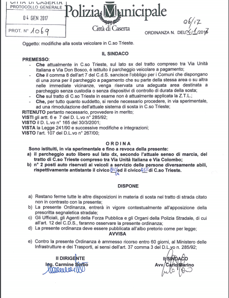Si posta in allegato l’ordinanza sindacale sosta 1° e 2° tratto Corso Trieste