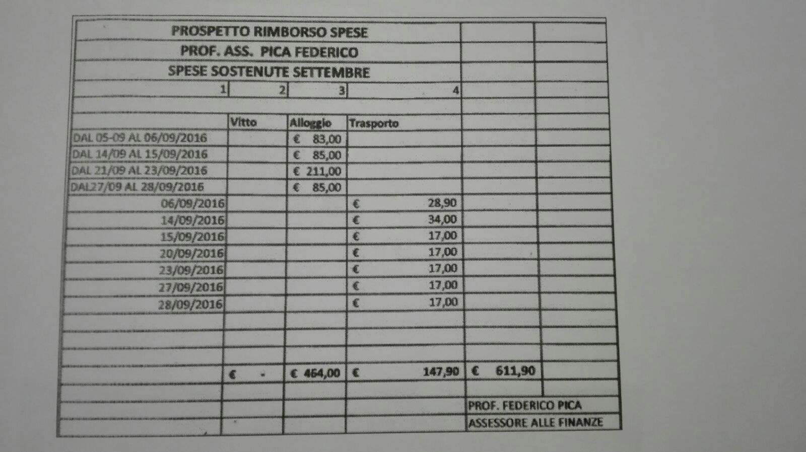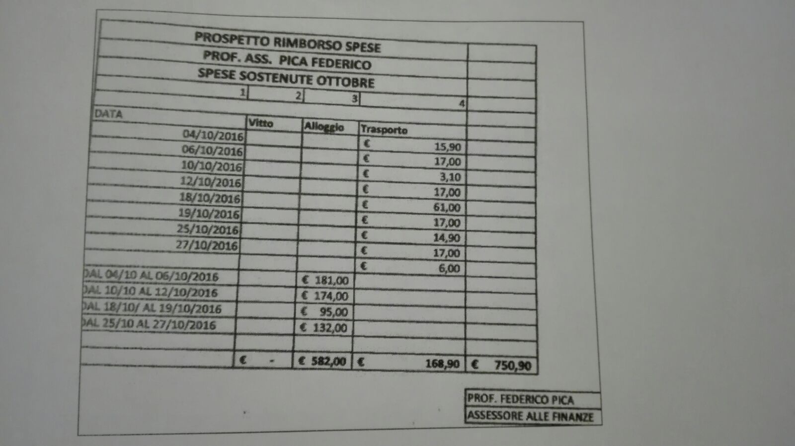 L’assessore al Bilancio, Federico Pica, ha richiesto all’Ente, il quale, versa in dissesto finanziario con contestuale procedura di riequilibrio in atto, il rimborso non solo delle spese di viaggio ma anche di vitto e alloggio. (stiratura e imbiancatura ? video )