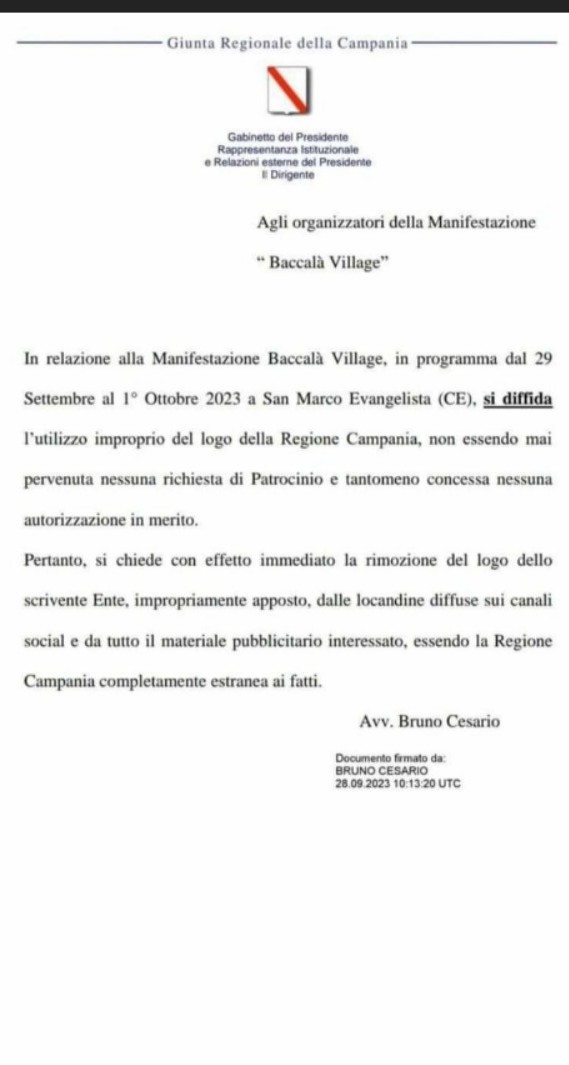 In sintesi, la Regione Campania ha preso provvedimenti contro l’uso improprio del suo logo nell’ambito del Baccalà Village e ha chiarito che non è coinvolta nell’organizzazione dell’evento.